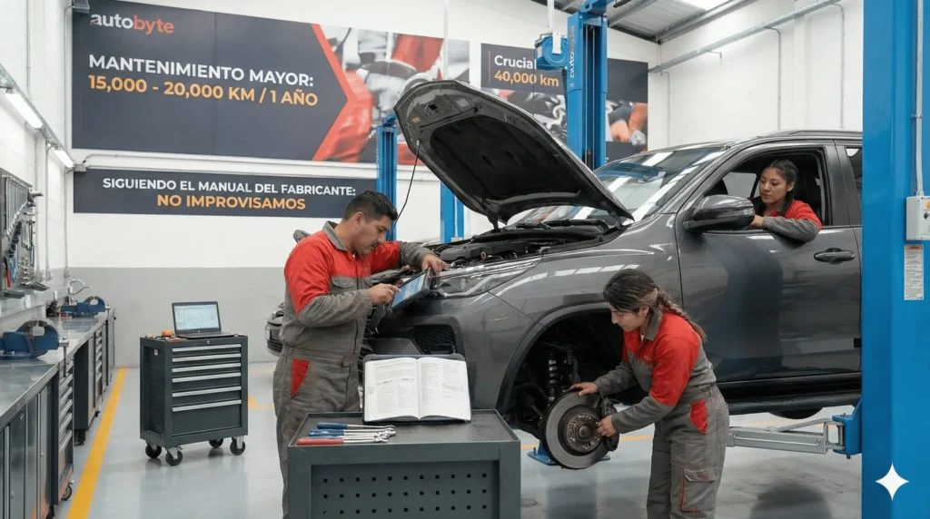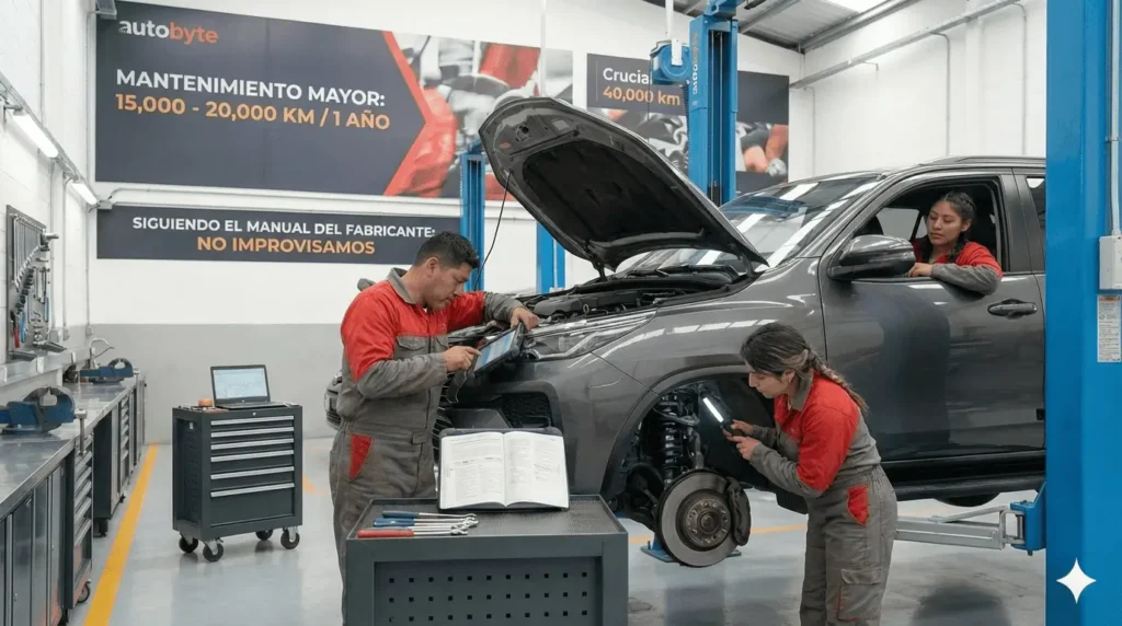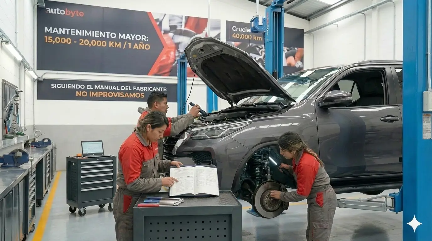 ¿Tu vehículo ha recorrido entre 15,000 y 20,000 km o ha pasado un año desde su última revisión importante? Es el momento ideal para realizar un Mantenimiento Mayor, un servicio integral diseñado para garantizar que tu auto siga funcionando como el primer día. En Autobyte, no improvisamos. Realizamos este servicio siguiendo estrictamente el manual del fabricante, asegurando que cada inspección cumpla con los estándares técnicos de tu marca.